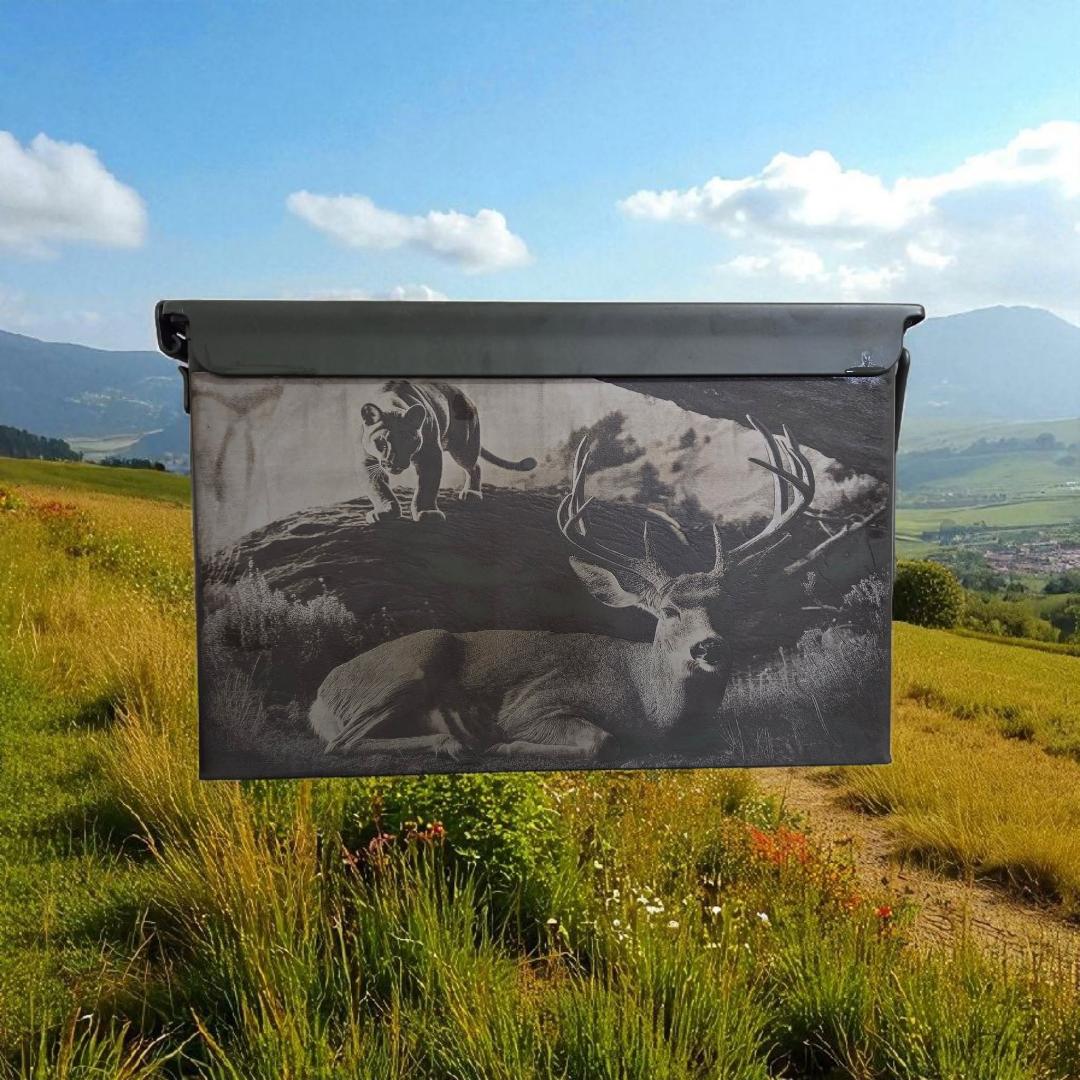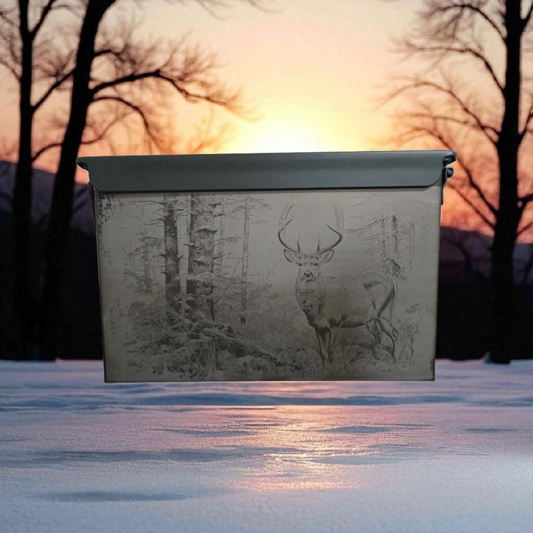 Here we have a quality ammo/storage box with a mule deer and a mountain lion putting a sneak on in the background that is laser etched followed by sever clear coats to keep protected for years to come. The reverse side is of a whitetail in standing in the forest. We are more than happy to do custom ammo cans with any images that are on this site to suit your needs.